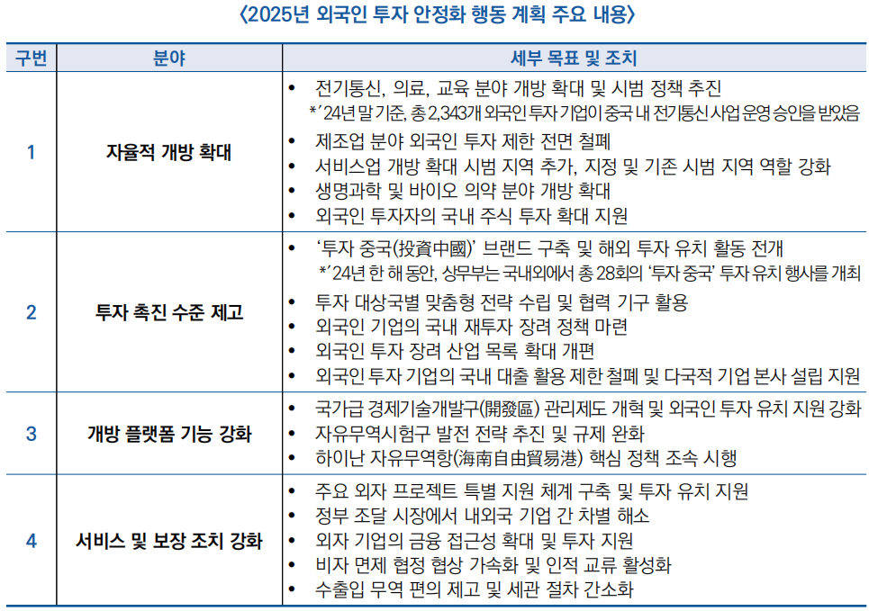 | 中, ‘2025년 외국인 투자 안정화(穩外資) 행동 계획’ 발표 | ||