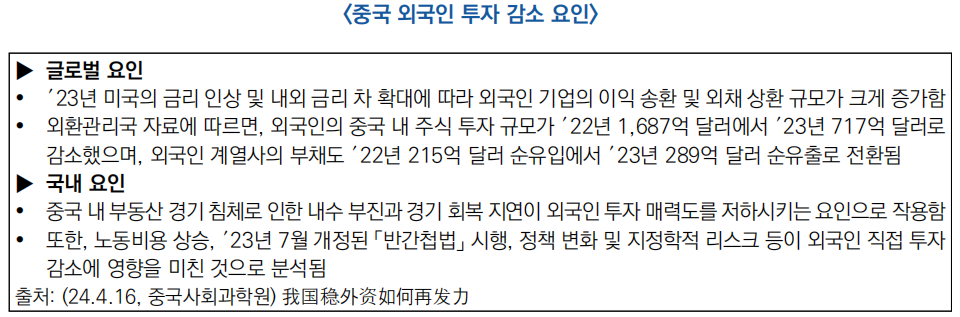 ○ (배경) ′23년 미국의 금리 인상, 중국 내 부동산 경기 침체, 정책 변화 등의 영향으로 외국인 투자 감소가 가속화되었으며, 이에 따라 외국인 자본 유출이 증가하는 추세를 보이고 있음