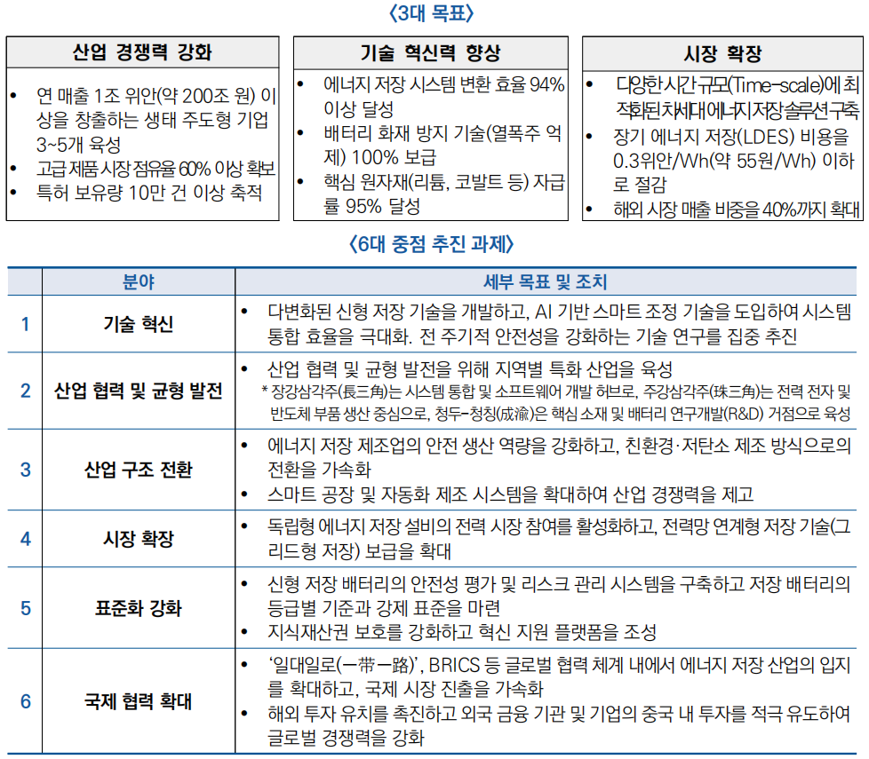 ![]() □ (계획) 최근 공업신식화부는 ‘차세대 에너지 저장 제조업 고품질 발전 행동 방안’을 발표해 ′27년까지 세 가지 목표를 설정했으며, 이를 달성하기 위해 6대 중점 추진 과제를 제시(25.2.17)