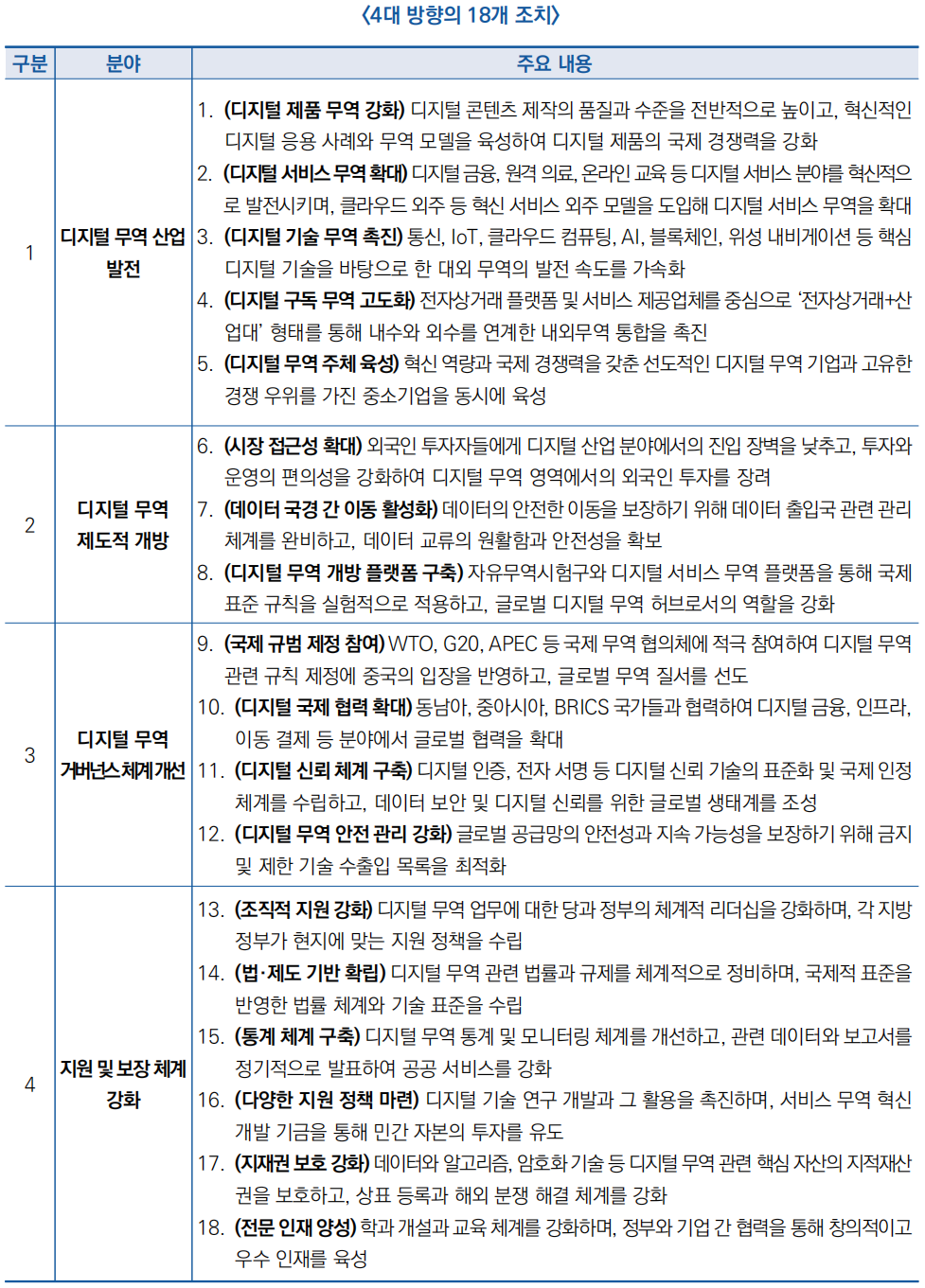 ○ 주요과제로 디지털 무역 산업 발전, 디지털 무역제도 개방, 디지털 무역 거버넌스체계 개선, 지원 및 보장 체계 강화 등 4대 방향을 제시