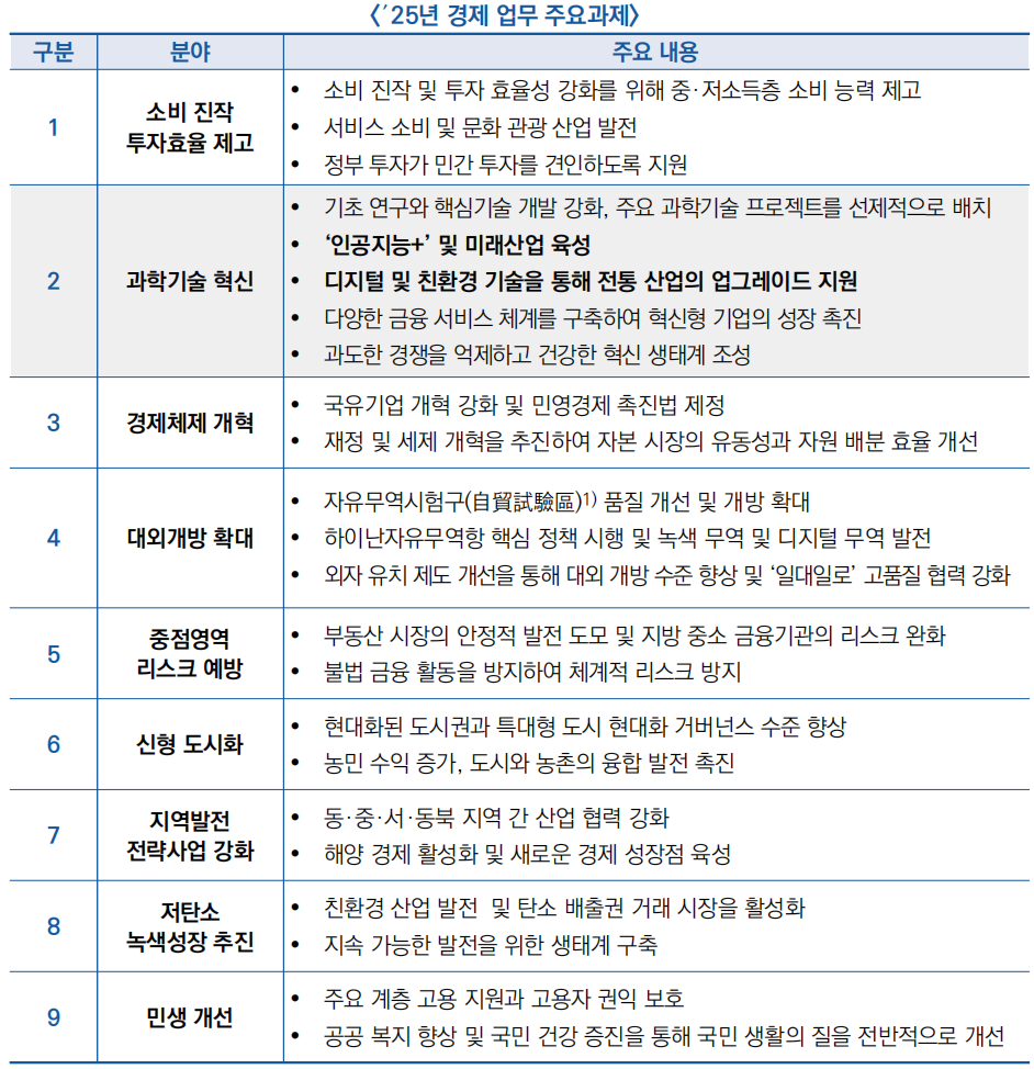 ○ 2025년 중국은 소비 진작을 최우선 과제로 설정하며 내수 확대에 중점을 두고, 과학기술 혁신은 2순위로 밀렸지만 여전히 장기적 성장 전략으로 유지되었는데, 이는 단기 회복과 지속 가능성 간 균형을 추구함을 시사함