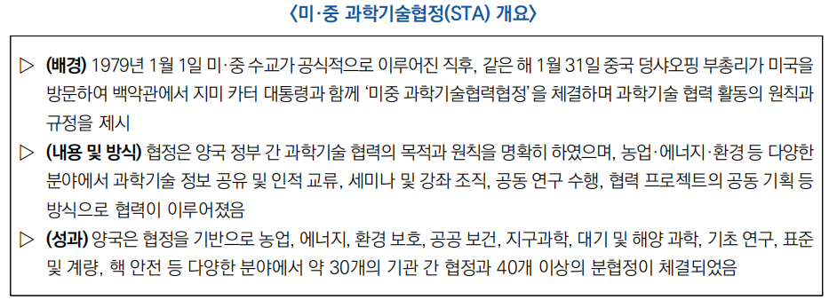 □ (배경) 미·중과학기술협정(STA)은 1979년 미·중 수교 당시 체결된 첫 양자 협정으로, 40여 년간 농업·에너지·환경·핵융합·지구·대기환경·해양과학·원격감지 기술 등 다양한 분야에서 미·중 연구자들에게 재정적, 법적, 정치적 지원을 마련