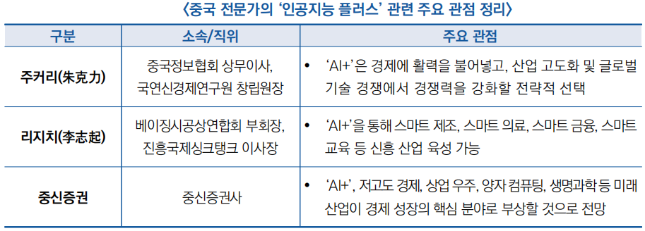 - ‘인공지능 플러스’는 AI 기술을 전통 산업과 심층적으로 융합하는 것을 목표로 생산성을 향상시키고, 자원 배분을 최적화하며, 새로운 경제 성장 동력을 발굴하는 데 중점을 둠