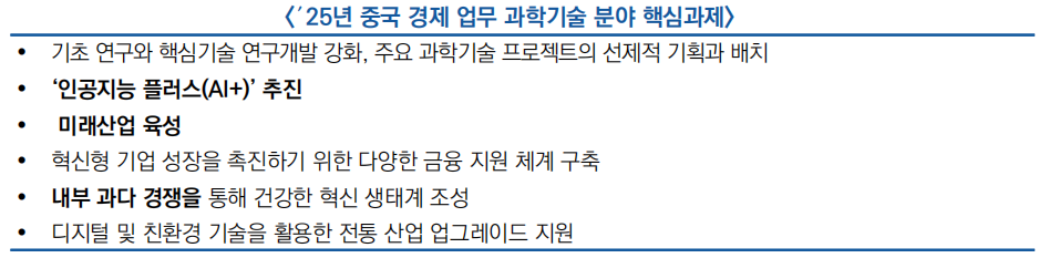 | ′25년 중국 경제 키워드, 소비진작 1순위, AI+, 미래산업 강화 | ||