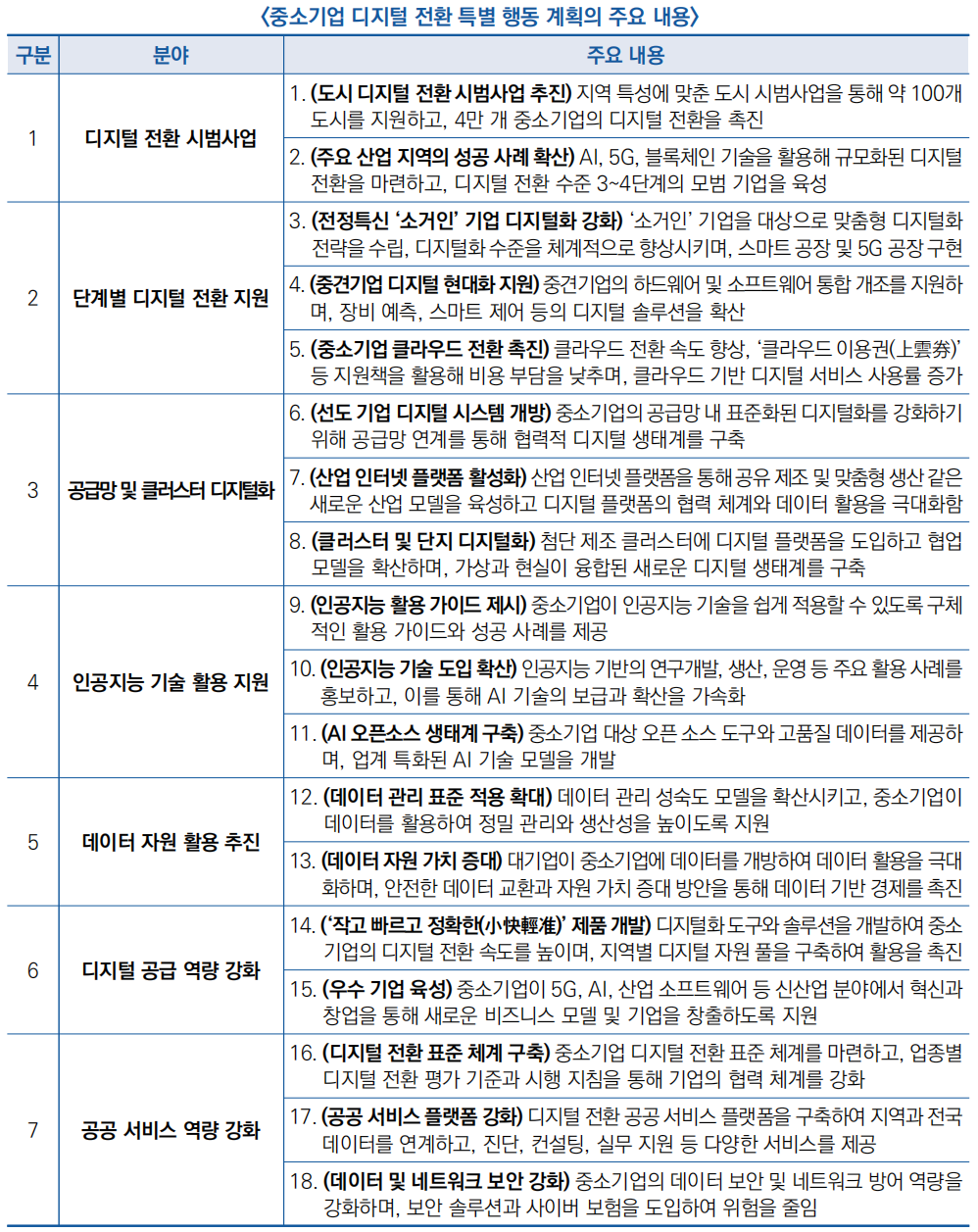 ![]() ○ 주요 과제로 디지털 전환 시범 사업, 단계별 디지털 전환 지원, 공급망 및 클러스터 디지털화 등 7대 방향을 제시