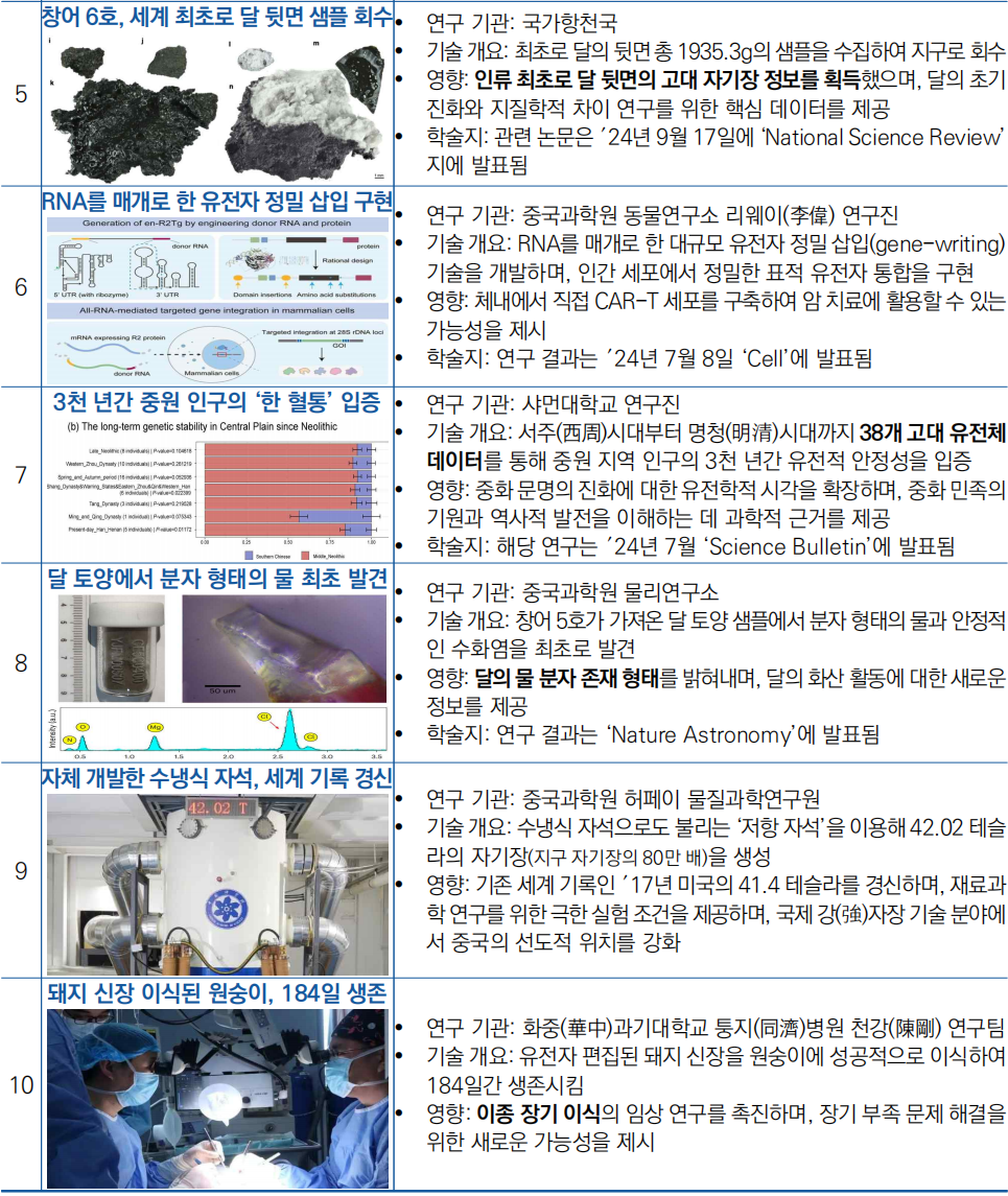 ○ 과학적 혁신성, 기술적 난이도, 사회적·경제적 영향력 기준으로 ▷ 창어 6호로 세계 최초로 달의 뒷면 샘플 회수 ▷ 광자의 분수 양자 이상 홀 상태 최초 구현 ▷ 자체 개발한 수냉식 자석으로 극한 실험조건의 세계 기록 경신 등 10대 성과를 선정