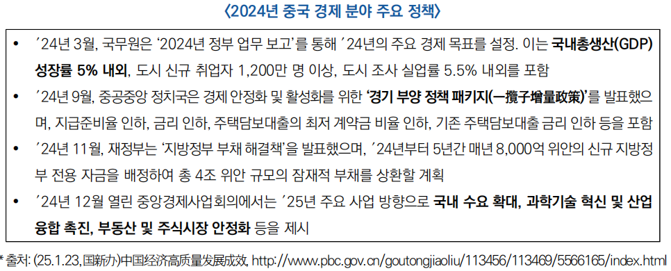 ○ 중국정부는 ′24년 경제 둔화 압박에 대응해 경제 성장 안정화, 내수 촉진, 핵심 분야 지원을 위한 적극적인 재정 및 통화 정책을 추진했음