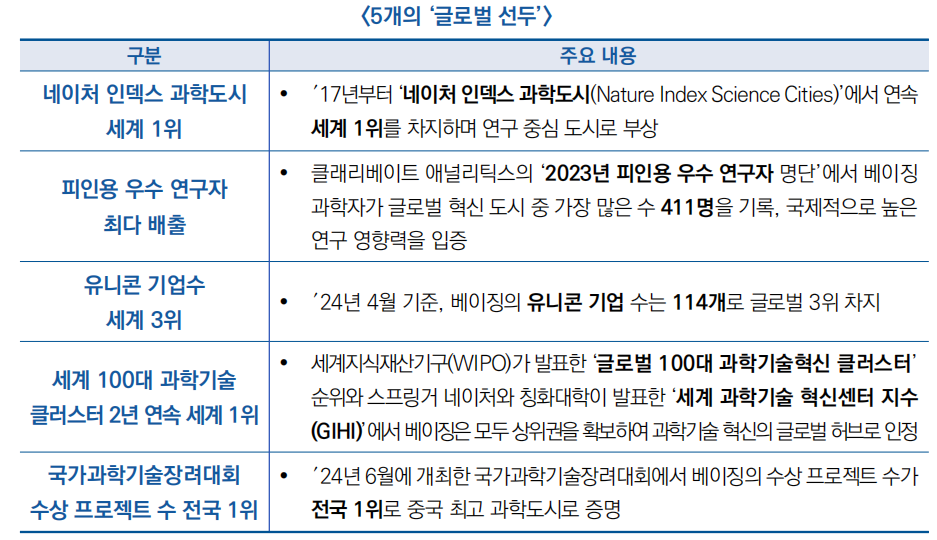 ○ (5개의 ‘글로벌 선두’) 2014년 이후 베이징은 과학기술 혁신을 통해 국제적 연구 중심지로서의 위상을 강화하였으며, 지속 가능한 발전을 위한 글로벌 리더로 자리 잡고 있음