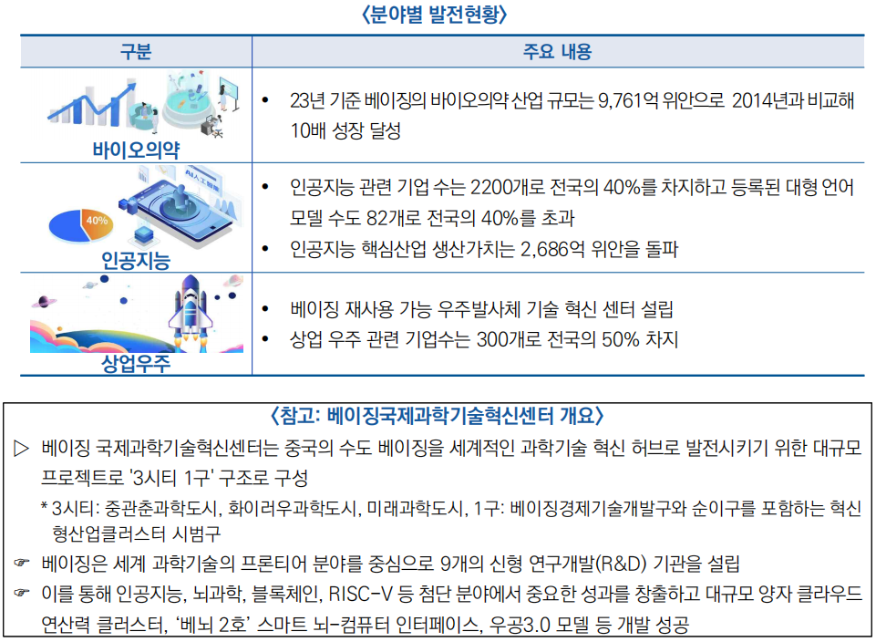 ○ 베이징은 인공지능(AI), 휴머노이드 로봇, 상업 항공우주 등 30여 개의 세부 산업 정책 지원 아래 ▷1조 위안급의 차세대 정보 기술, 과학기술 서비스업 산업 클러스터 2개 ▷1천억 위안급의 의약·헬스, 집적 회로(IC) 등 산업 클러스터 8개 구축