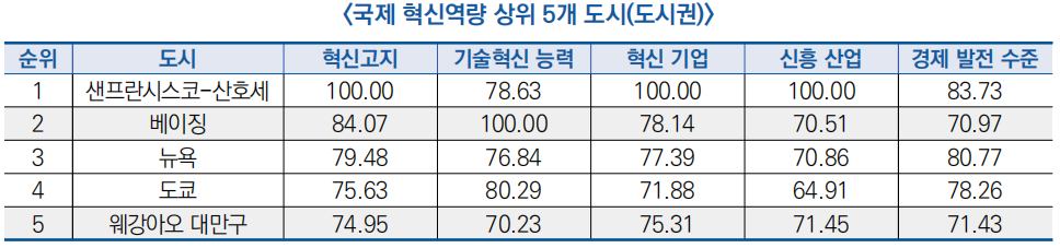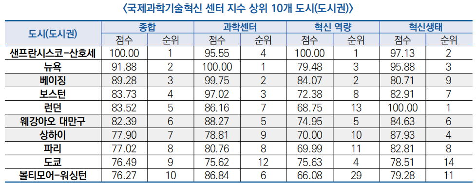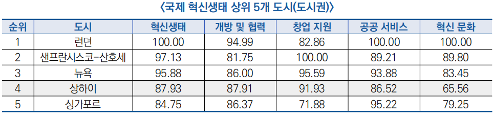 - 혁신생태 글로벌 순위에서는 런던이 1위를 차지, 샌프란시스코-산호세, 뉴욕, 상하이가 각각 2위, 3위, 4위를 기록