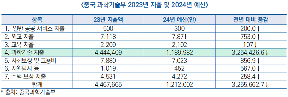 ○ 중국 과학기술부 기능 재편에 따라 일부 프로젝트가 이관되어 ′24년 예산은 총 121.2억 위안으로 전년 대비 72.9%(△326억) 감소