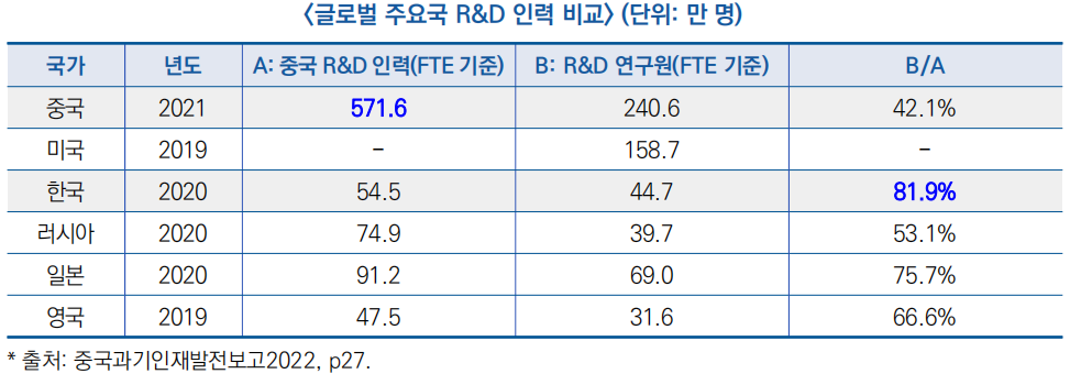 ○ ′21년 기준, 중국의 R&D 인력은 총 858.1만 명, FTE 기준(Full-Time Equivalent/실질연구참여인력) 571.6만 명으로 세계 1위를 유지