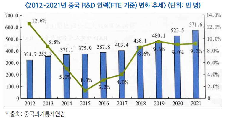 - 중국의 R&D 인력(FTE 기준)은 2021년 571.6만 명으로 크게 증가하며 연평균 9~10%의 성장률을 기록