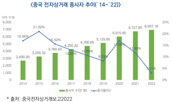 ○ (규모) 중국 정부는 국가 직업 대전 분류에 ‘전자상거래 서비스 종사자’를 추가했으며, ′22년 중국의 전자상거래 관련 종사자 수는 6,937.18만 명으로 전년 대비 3.11% 증가