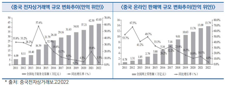 □ (산업) 중국 상무부(商务部)가 발표된 ‘2022 중국 전자상거래 보고(′23.6월)’에 따르면 ′22년 기준 중국의 전자상거래 규모는 43.83조 위안으로 전년 대비 3.5% 증가