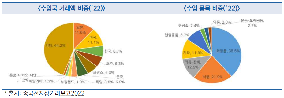 ![]() ○ (품목별) 수입 품목의 거래액 비중은 화장품이 38.5%로 가장 높고, 식품 21.9%, 의류·잡화 12.5%로 상위 3개 품목의 거래액 비중이 72.9%에 달함