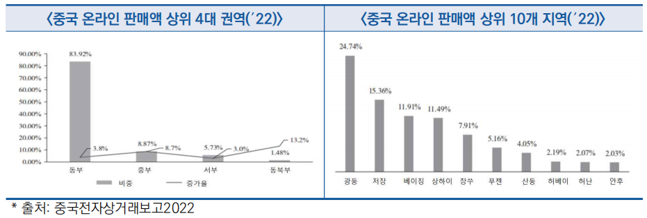 - (지역별) 판매액 비중은 광둥 24.74%, 저장 15.36%, 베이징 11.91%, 상하이 11.49%, 장쑤성 7.91% 순으로 나타났으며, 상위 10개 지역의 비중이 86.91%에 달함