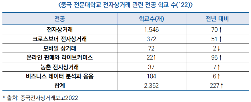 - 2년제 전문대학교의 전자상거래 관련 전공은 크로스보더 전자상거래, 모바일 상거래, 온라인 판매와 라이브커머스, 농촌 전자상거래, 비즈니스 데이터 분석과 응용 등으로 구분