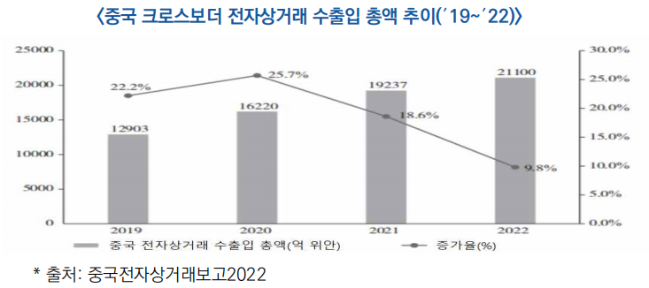 ○ (규모) 중국의 크로스보더 전자상거래 규모는 꾸준히 증가하고 있음. 중국 해관총서 통계에 따르면 ′22년 크로스보더 전자상거래(B2B 포함) 수출입 총액은 2조 1,100억 위안(412조 원)으로 전년 대비 9.8% 증가