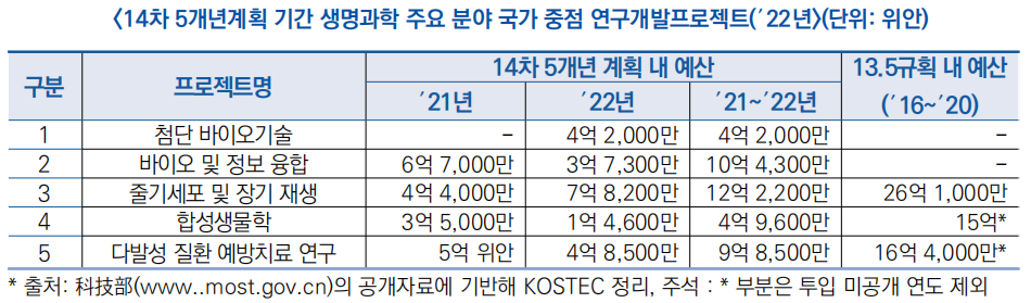 ○ ‘국가 중점 연구개발프로젝트’('15년)는 최근 5년간 생명과학의 최첨단 분야인 뇌과학, 합성생물학, 페노믹스, 계산생물학, 유전자 및 세포 치료 등 분야 투자 확대