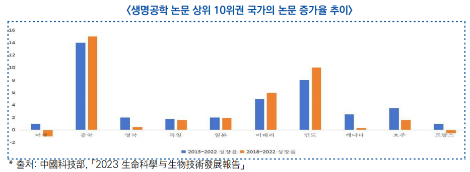 - 2011~2022년까지의 중국 생명과학 논문의 연간성장률은 13.54%로 타 국가 대비 높은 편임