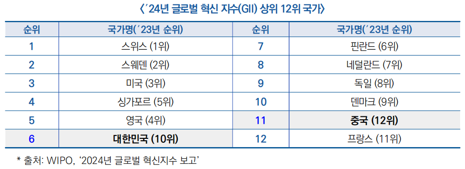 ![]() □ (종합) 세계지식재산권기구(WIPO)의 ‘2024 글로벌 혁신 지수(GII)’에 의하면, 혁신투입(제도, 인적자본, 인프라, 시장 및 기업 고도화) 및 혁신산출(지식, 기술, 창의적 산출) 양대 지표에서 중국은 2014년 29위에서 2024년 11위로 상승