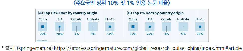 ![]() ○ 스프링거 네이처 (Springer Nature)에 분석에 의하면, ′21년 기준으로 중국은 고인용 상위 10% 논문 점유율 29%와 상위 1% 논문 점유율 32%로 모두 미국을 추월함