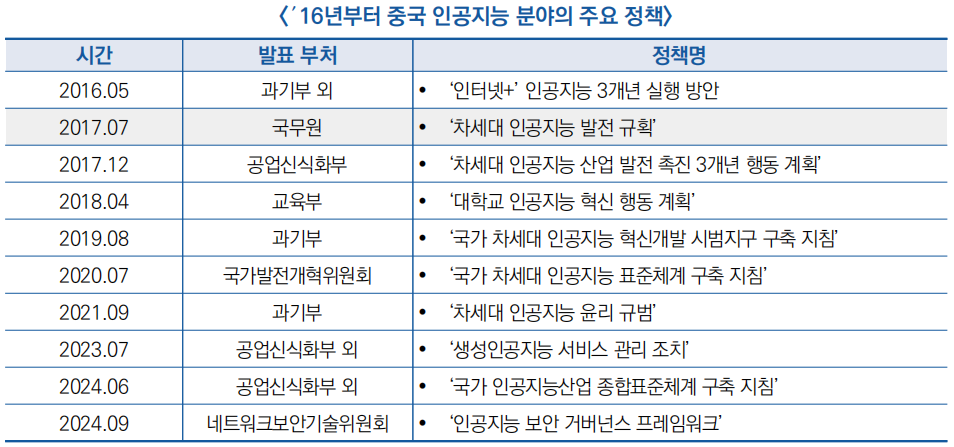 ○ (정책 동향) 중국은 인공지능(AI) 산업의 지속적 발전을 위해 인재 양성, 기술 혁신, 세제 혜택, 지식재산권 보호 등 다각적 지원 정책을 추진