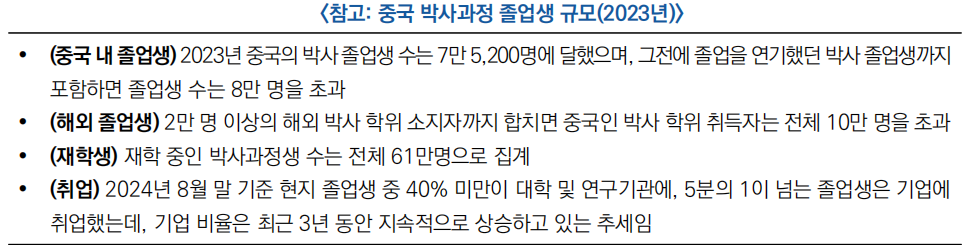 ○ 이번 정책은 중미 기술경쟁 등 배경 속에서 향후 학술형과 기술 전문형 박사에 대한 분류를 명확히 하고, 각기 다른 교육 방식과 평가 체계를 통해 학문적 발전과 산업적 요구를 동시에 충족할 수 있는 다양한 박사 인재를 양성하겠다는 국가 의지를 보여줌