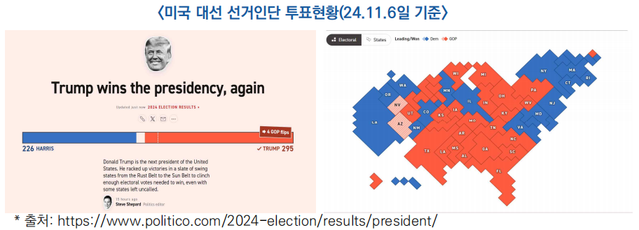 □ 11일 5일(현지 시간) 진행된 미국 2024 대통령 선거에서 도널드 트럼프 후보가 민주당 후보 카밀라 해리스를 제치고 재선에 성공(24.11.6)