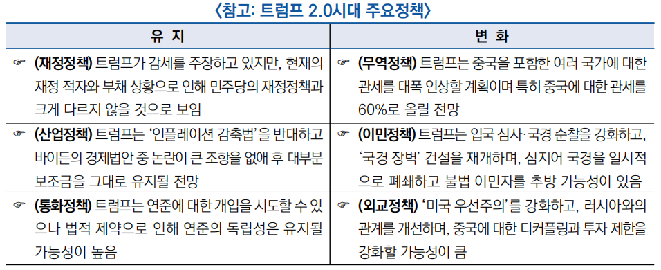 ○ 트럼프가 재선된 후, 제정·산업·통화 등 정책을 유지할 것이며 무역·이민·외교 정책에 대한 큰 변화를 가져올 것으로 예상