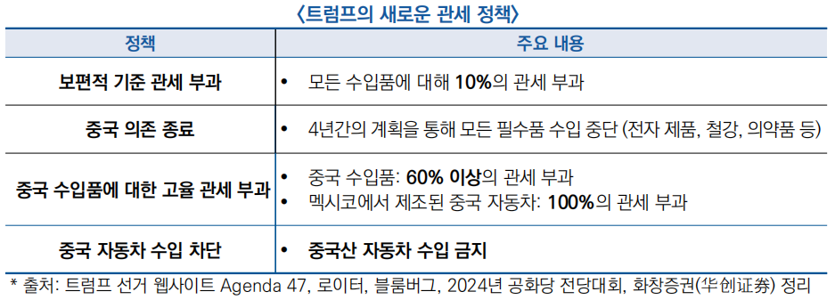 - 트럼프의 두 번째 임기에서는 더욱 공격적인 관세 조치를 취할 것으로 예상되며, 중국의 태양광 패널, 에너지 저장 배터리, 신에너지 자동차 등 제품에 대해 관세를 확대할 것으로 예상
