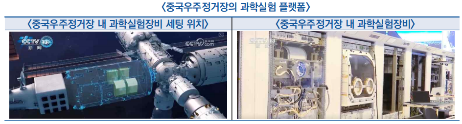 ○ 중국우주정거장의 밀폐된 모듈 내부에는 생명 생태계, 유체 물리학, 무(無)용기 재료 등 14개의 과학 실험 장비가 배치되어 고강도의 우주과학 실험을 수행할 수 있는 플랫폼을 형성함