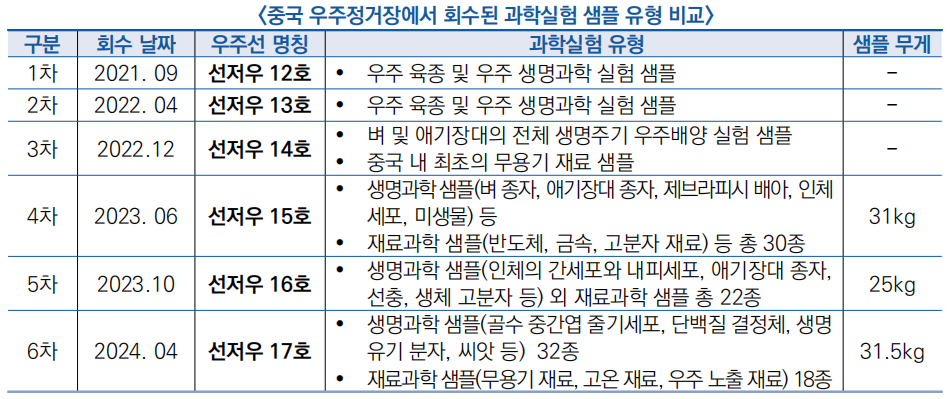 □ (배경) 중국은 이미 총 6회에 걸쳐 중국우주정거장으로부터 300여개의 과학실험 샘플을 회수하였으며, 생명과학, 소재과학, 기초물리 등 다양한 분야에서 우주기술을 적극 활용하는 추세임(24.10.4)