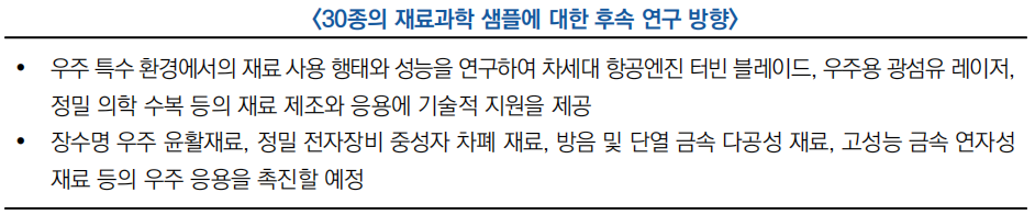 - 재료 샘플에는 고온 난용성 니오븀 합금, FeSi 기반 연자성 합금, 생체활성 유리, 복합 윤활재료, 광섬유 및 광학 박막 등 30종이 포함됨