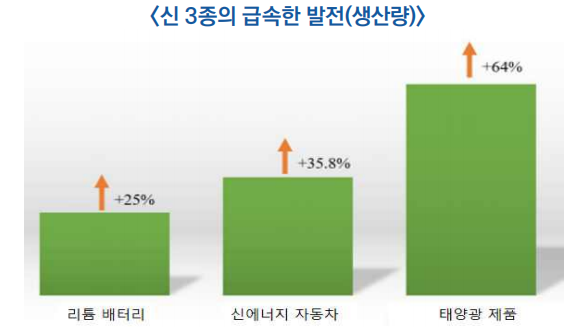 □ 특히 2023년 중국이 주력으로 수출하고 있는 ‘신 3종(新三样, 신에너지 자동차·리튬배터리·태양광 제품)’의 경제 부가가치는 223,528억 위안으로 전년 대비 6.4% 증가