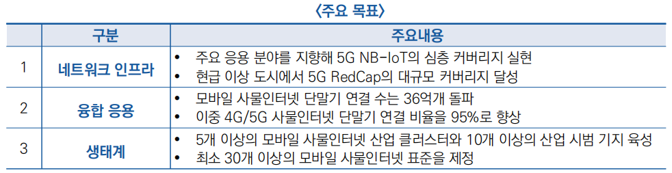 ○ 주요 목표로 2027년 말까지 4G(특히 LTE-Cat1)와 5G(NB-IoT 협대역 사물인터넷, RedCap 경량화) 기술을 결합한 포괄적인 모바일 사물인터넷 생태계 구축을 제시