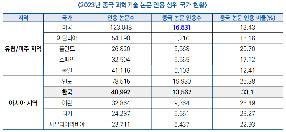- 2023년 기준, 총 161개국이 중국의 과학기술 논문을 인용한 가운데, 인도가 19,930편으로 가장 많은 논문을 인용하였으며, 미국은 16,531편, 한국은 13,567편으로 각각 2, 3위를 차지