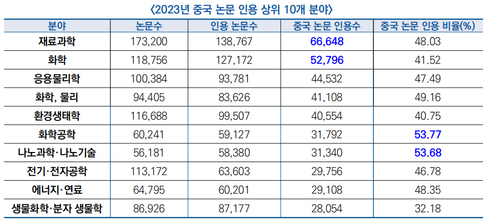 - 2023년, 국제적으로 중국 논문이 가장 많이 인용된 분야는 재료과학(66,648편)와 화학(52,796편)으로 나타났음