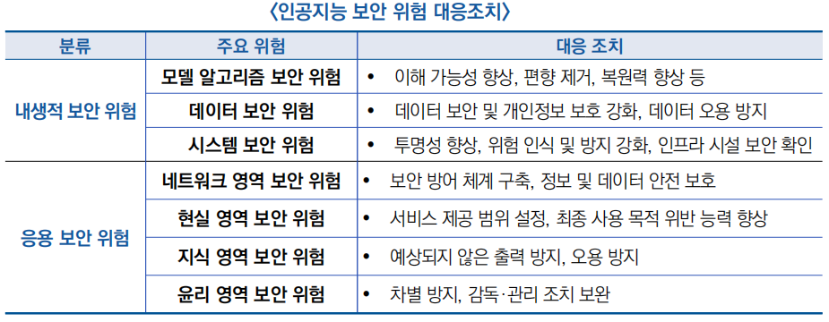 - (내생적 보안 위험) 인공지능 모델 알고리즘 보안 위험, 데이터 보안 위험, 시스템 보안 위험 등 3대 위험 요소 분석과 대응 방안 마련