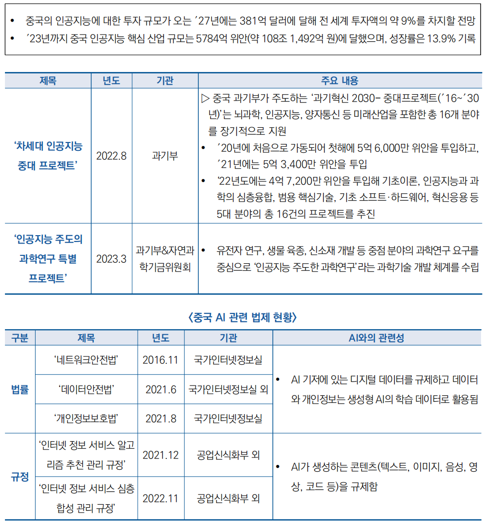 ![]() □ 중국 과기부 주도로 ‘차세대 인공지능 중대 프로젝트’와 ‘인공지능 주도의 과학연구 특별 프로젝트’를 통해 미래산업을 장기적으로 지원하고, 동시에 AI 관련 법제를 통해 디지털 데이터와 AI 생성 콘텐츠를 규제하고 있음
