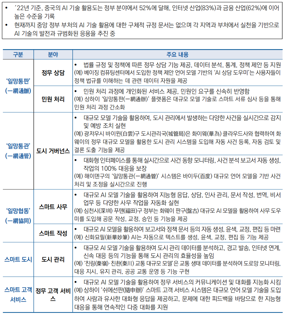 □ 중국은 AI 기술을 정부 상담, 민원 처리, 도시 거버넌스, 스마트 사무, 도시 관리 등 다양한 분야에 적극 활용