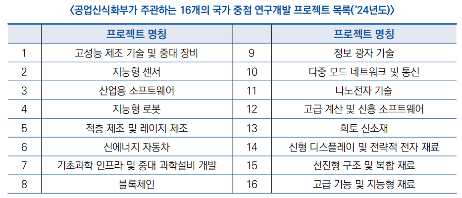 ○ 국가중점연구개발계획의 2024년도 신청 가이드라인에는 지능형 로봇, 신에너지자동차 등 16개 전략적 신흥산업 분야가 포함됨