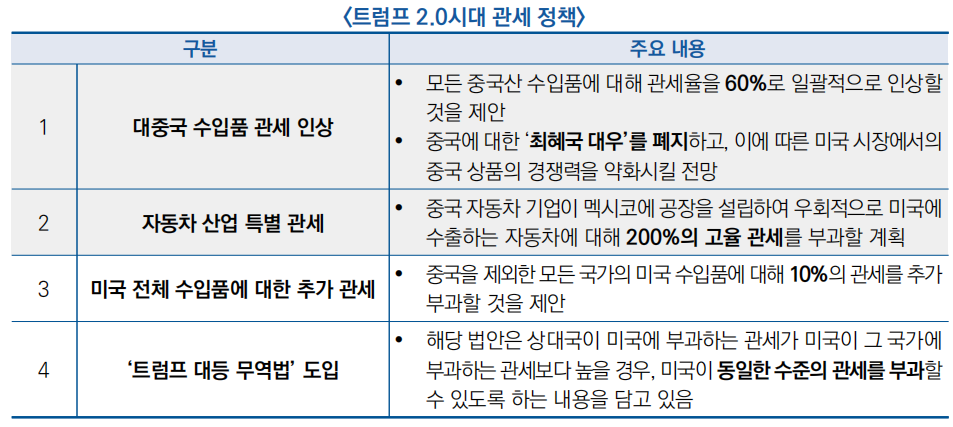 - 이번 트럼프의 관세 제안은 중국에 국한된 것이 아니고, 미국의 모든 무역 파트너에 대해 관세를 인상하는 방향으로 추진될 가능성이 존재