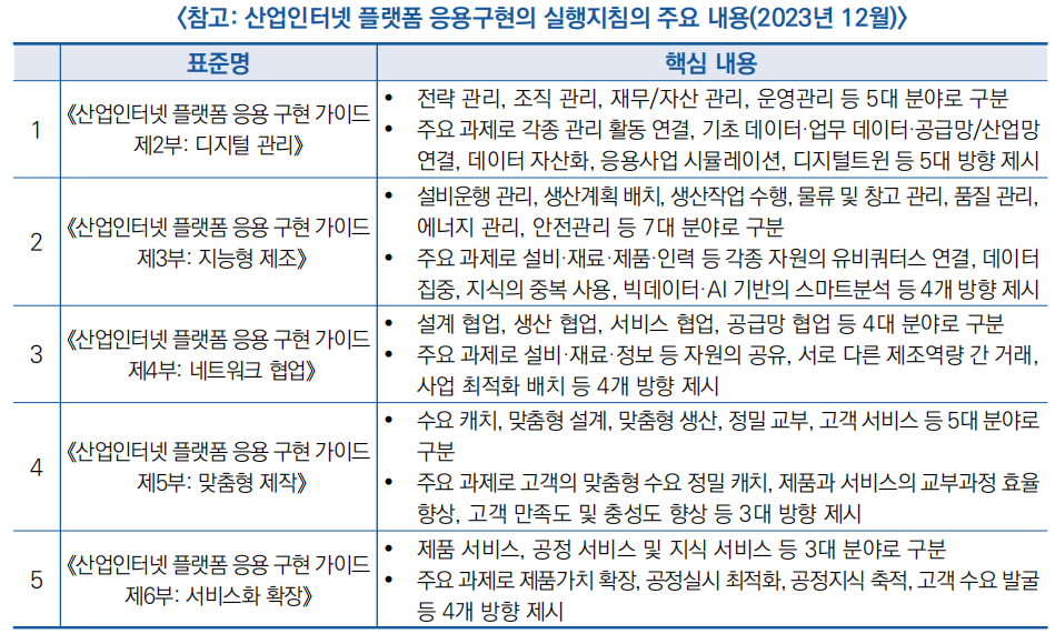 □ 이번에 제정된 표준의 경우, 2022년 10월에 발표된 《산업인터넷 플랫폼 기업 응용수준 및 실적 평가》와 《산업인터넷 플랫폼 응용 구현 가이드 : 제1부 총칙》, 2023년 12월에 발표된 실행지침의 후속 작업에 해당되며, 향후 산업별 디지털 관리, 지능형 제조, 네트워크 협업, 맞춤형 제작, 서비스화 확장 등 산업의 디지털전환과 플랫폼화를 가속화시킬 수 있는 추가적인 국가 표준이 공표될 것으로 전망