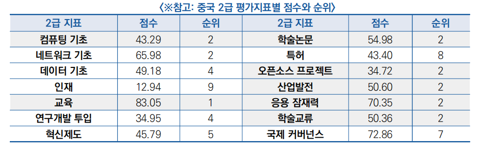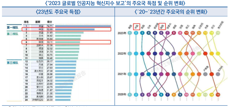 - 미국(74.71점)의 인공지능 혁신지수는 5년 연속 1위를 차지하고 중국(52.69점)은 최근 4년 연속 2위 차지