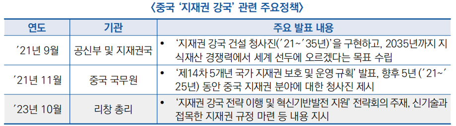 ![]() - 중국은 ‘14차 5개년 규획’에서 강조한 바와 같이 ‘지재권 강국’ 전략 이행을 위해 ′21년 지재권 강국건설의 청사진 발표부터 각종 지침 및 법령 등을 잇따라 발표