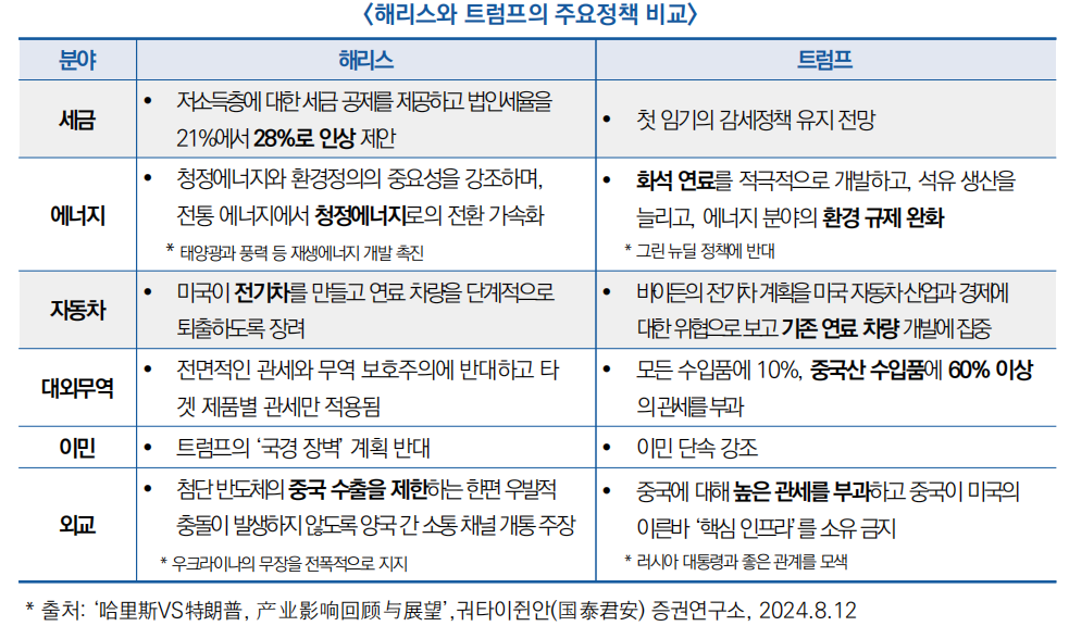 ![]() □ 미국 대선 결과에 따라 특정 산업에 영향을 미칠 수 있으며 전반적으로 해리스의 정책은 지속 가능한 발전, 환경 보호, 사회적 형평성 등에 중점을 두고 있음(2024.8.15)