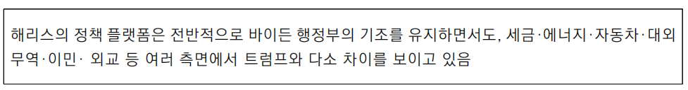 ○ 해리스의 정책 플랫폼은 전반적으로 바이든 행정부의 기조를 유지하면서도, 세금·에너지·자동차·대외 무역·이민·외교 등 여러 측면에서 트럼프와 명확한 차이를 보임