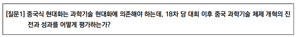 ▷ 다만, 세계 과학기술 강국과의 비교, 과학기술 강국 건설 목표와 요구에 견주어 봤을때, 중국의 과학기술 역량은 아직 충분하지 않으며, 과학기술 체제 메커니즘도 아직 충분히 완비되지 않았고, 국가 혁신 체계의 전체적인 효율성도 충분히 높지 않은 것이 현실